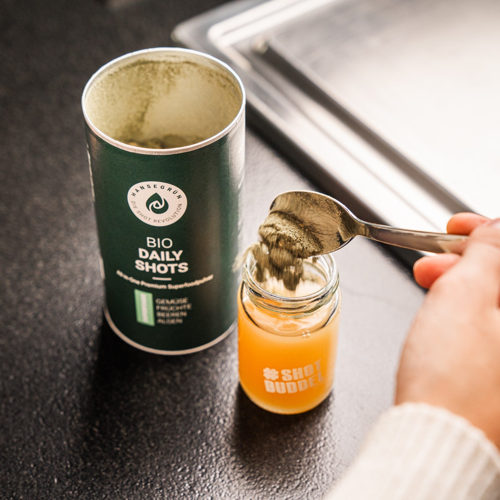Der perfekte Start in den Tag: Unsere Daily Shots bieten die ideale Basis mit 22 ausgewählten Superfoods aus Greens, Beeren, Gemüse und Algen. So integrierst du Routinen ganz einfach in deinen Alltag. Ergänze den Shot am besten mit unseren Vitamin D3K2 Tropfen für dein Immunsystem¹.