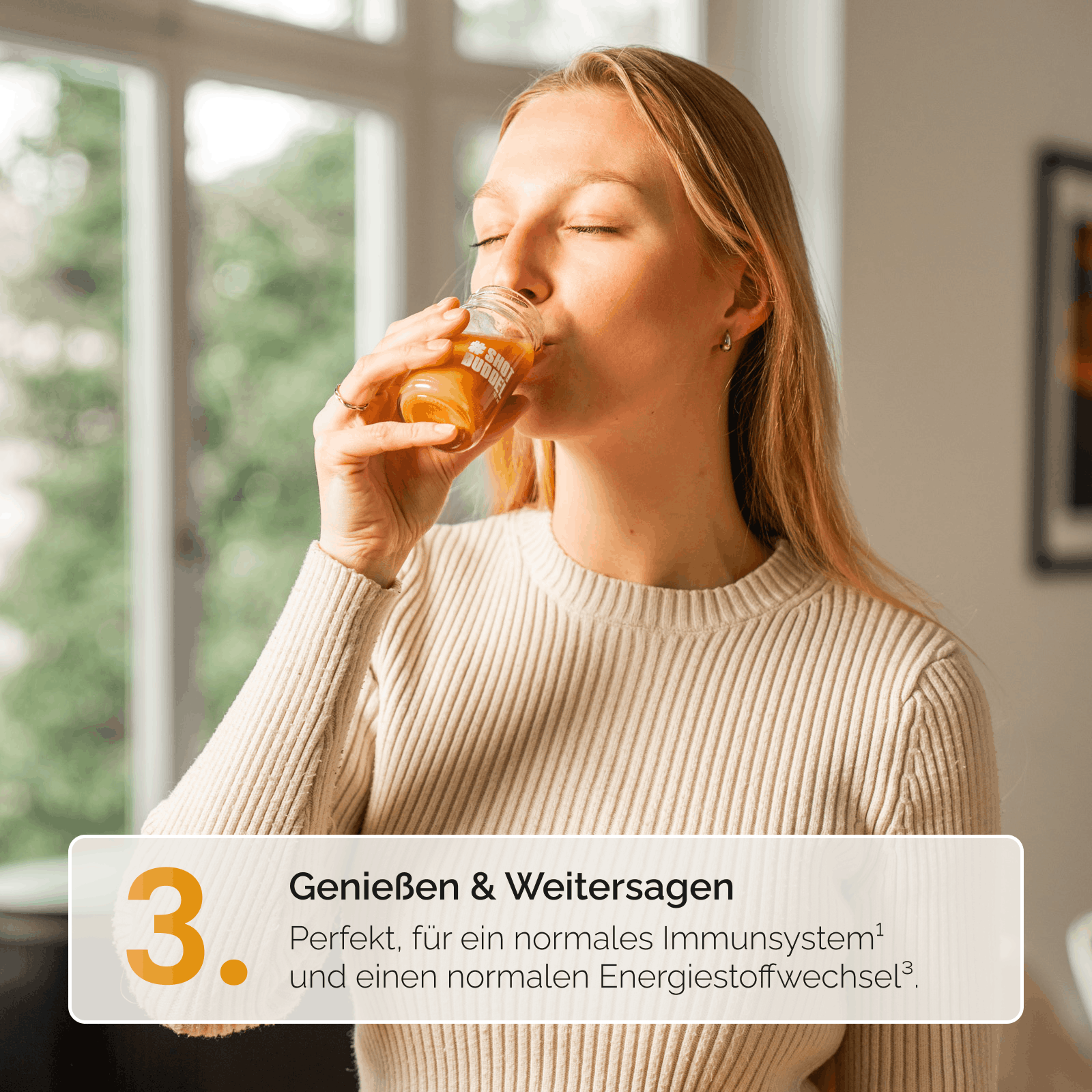 Seit 2020 vertrauen täglich über 50.000 Kunden auf unsere Shots. Die kraftvollen Kombinationen aus hochwertigen Bio-Zutaten wie Ingwer, Kurkuma, Zitrone und natürlichem Vitamin C unterstützen dein Immunsystem, deinen Stoffwechsel und sorgen für den perfekten Start in den Tag.
